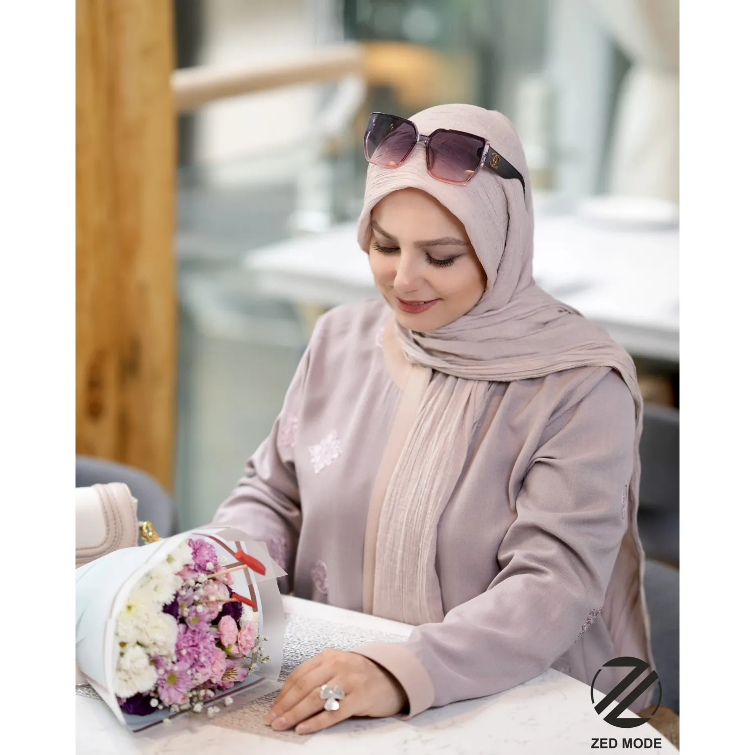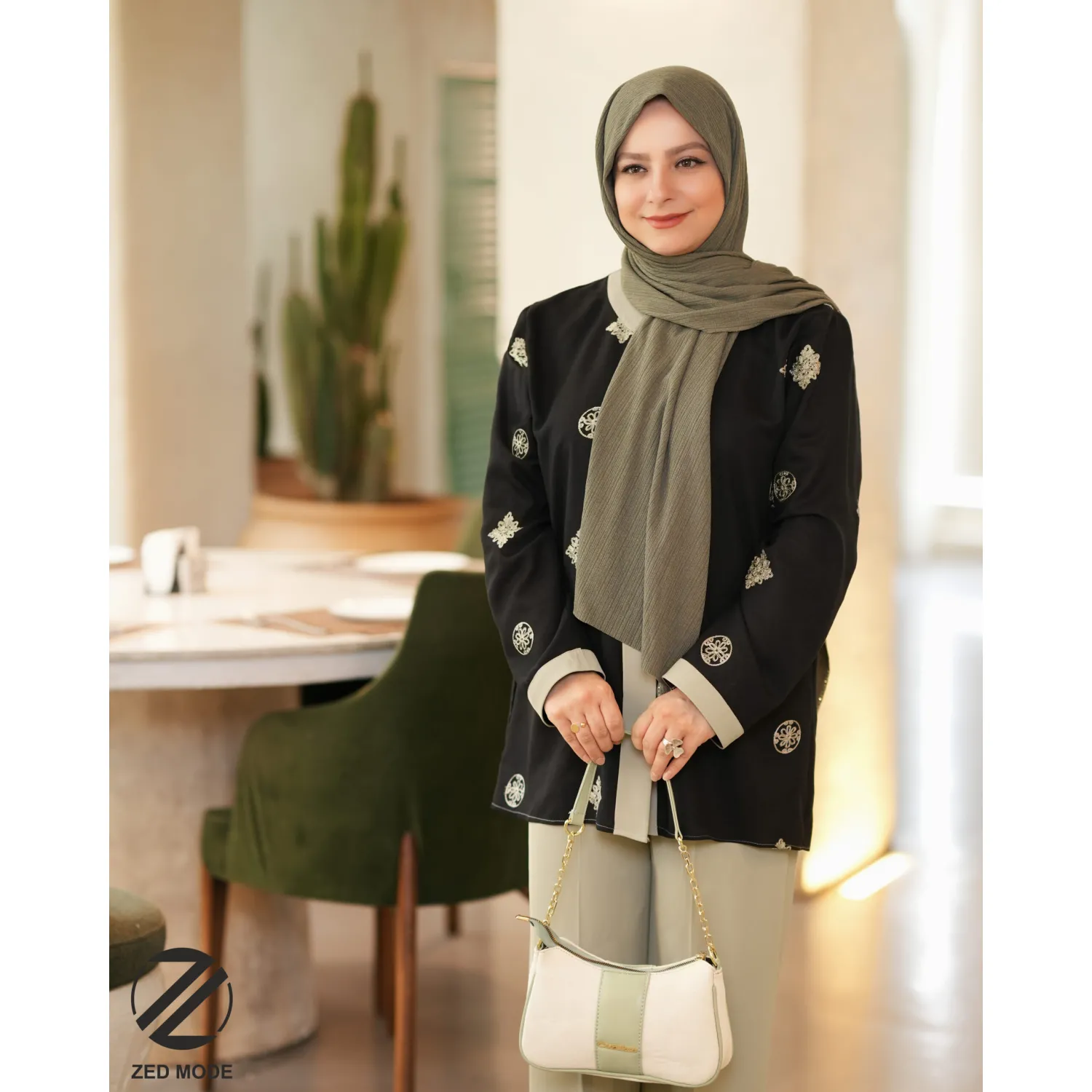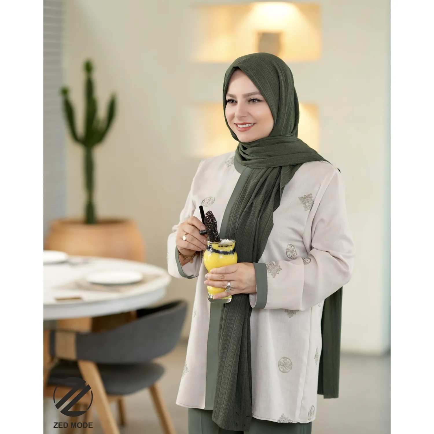 جنس تونیک: نخ اسلپ دار گلدوزی شده ،جلو دکمه مخفی ،قد حدود۸۰ ، یقه گرد ساده