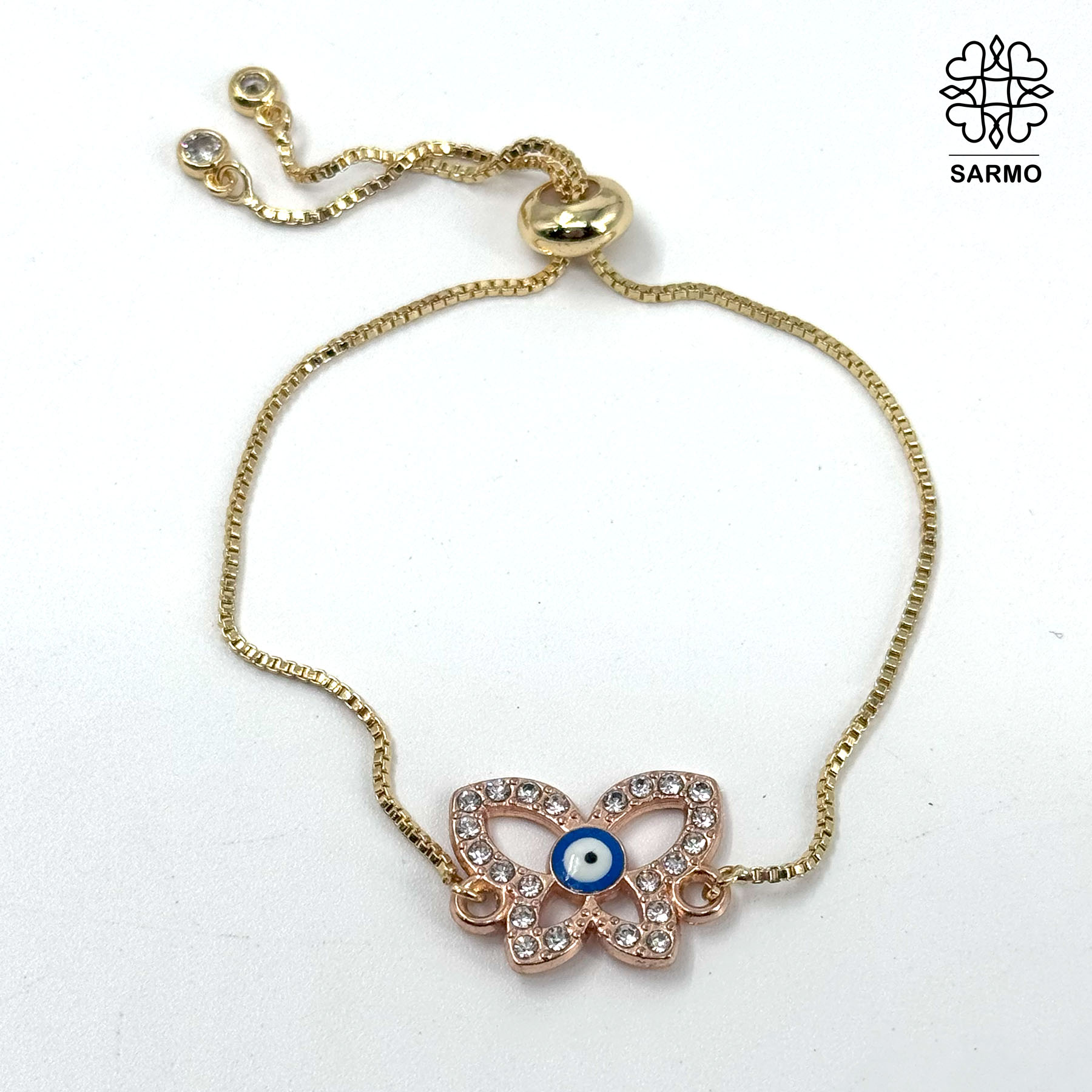 - این دستبند ظریف و جذاب با طرح پروانه، مزین به نگینهای درخشان و مهرهی آبی چشمنظر، ترکیبی هنرمندانه از زیبایی، ظرافت و معنا را به استایل شما اضافه میکند. پروانه نماد آزادی و تحول است و چشمنظر به عنوان یک نماد محافظ، برای دفع انرژیهای منفی شناخته میشود.