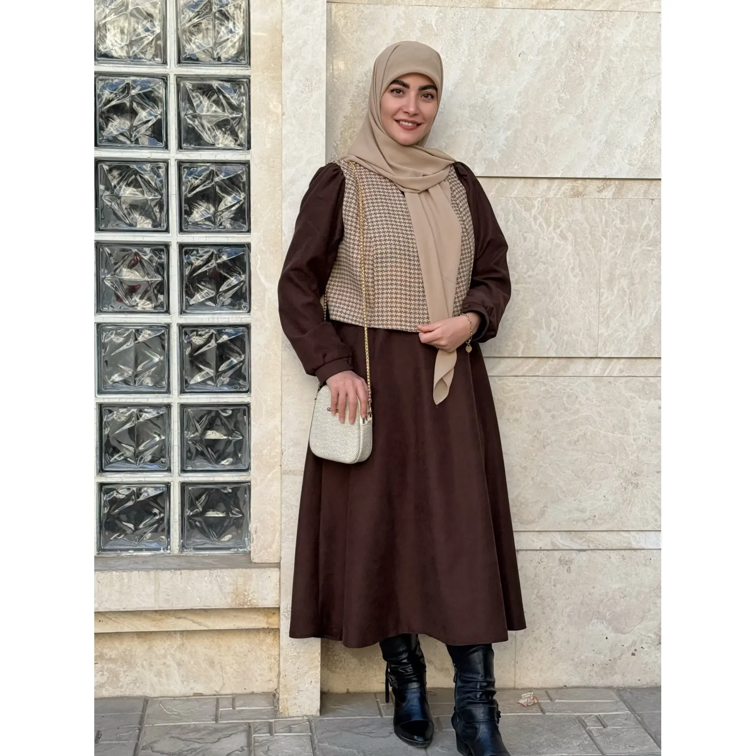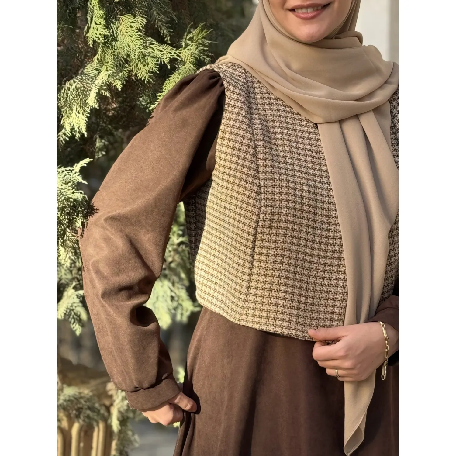 ست جلیقه و پیراهن خزان قهوه ای
