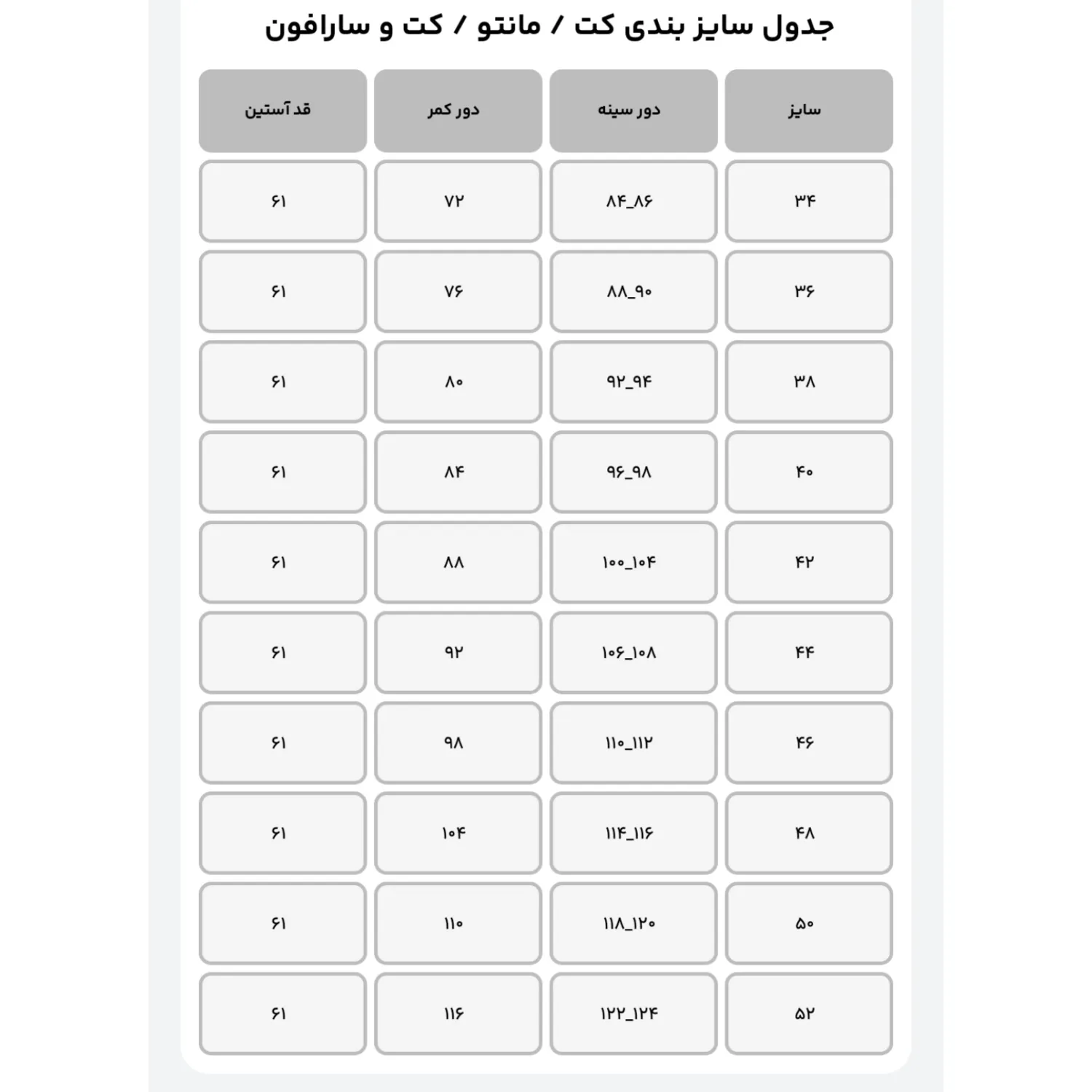 لطفا توجه داشته باشيد براى بدست اوردن سايز درست حتما دور سينه را بصورت فيت و بدون آزادى اندازه گیری شود.سپس با جدول مطابقت دهيد.چون هنگام برش آزادئ اصولى و لازم برای برش کت و سارافون انجام شده است.