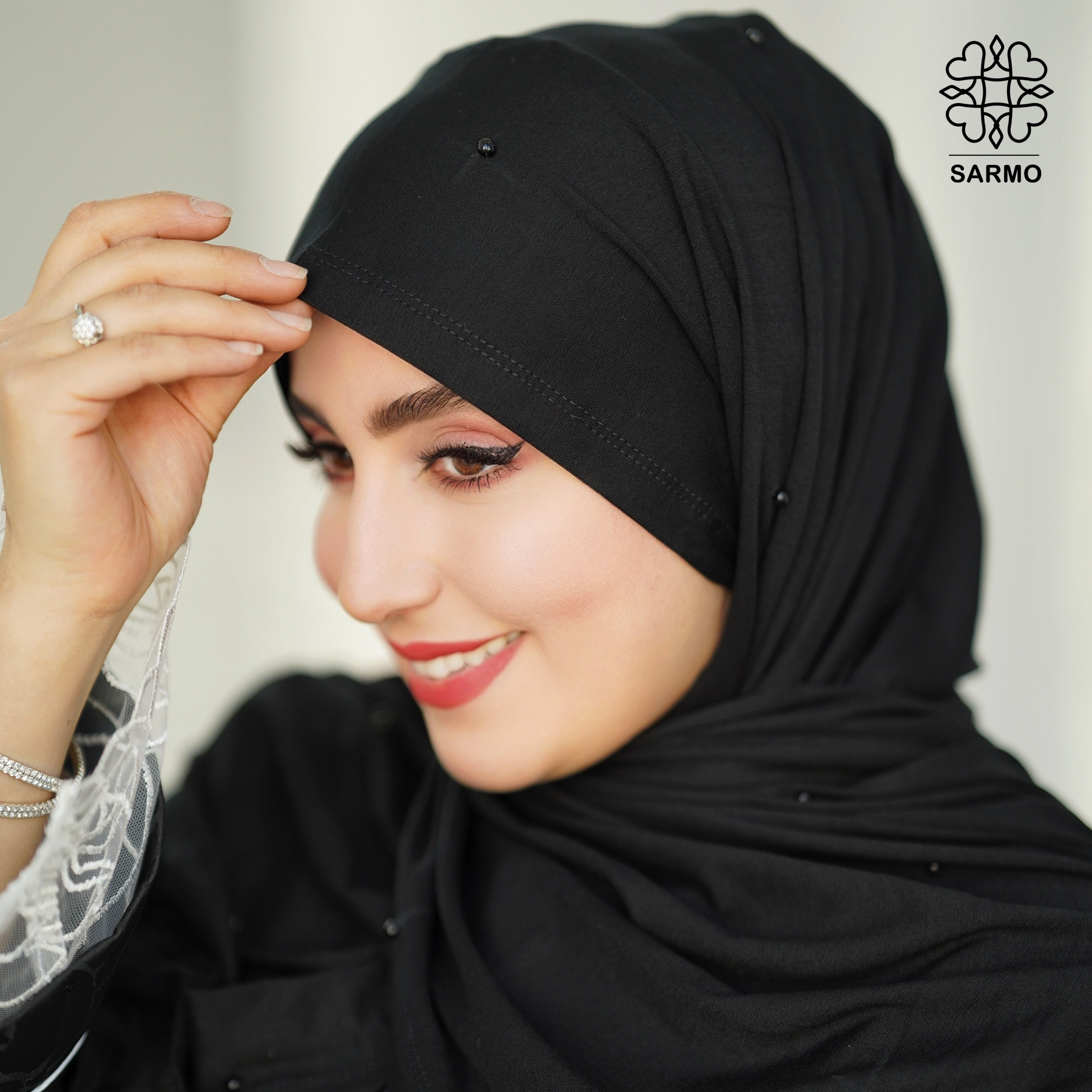✨ جنس پارچه: نخی لطیف، تزئینشده با مرواریدهای مشکی ظریف