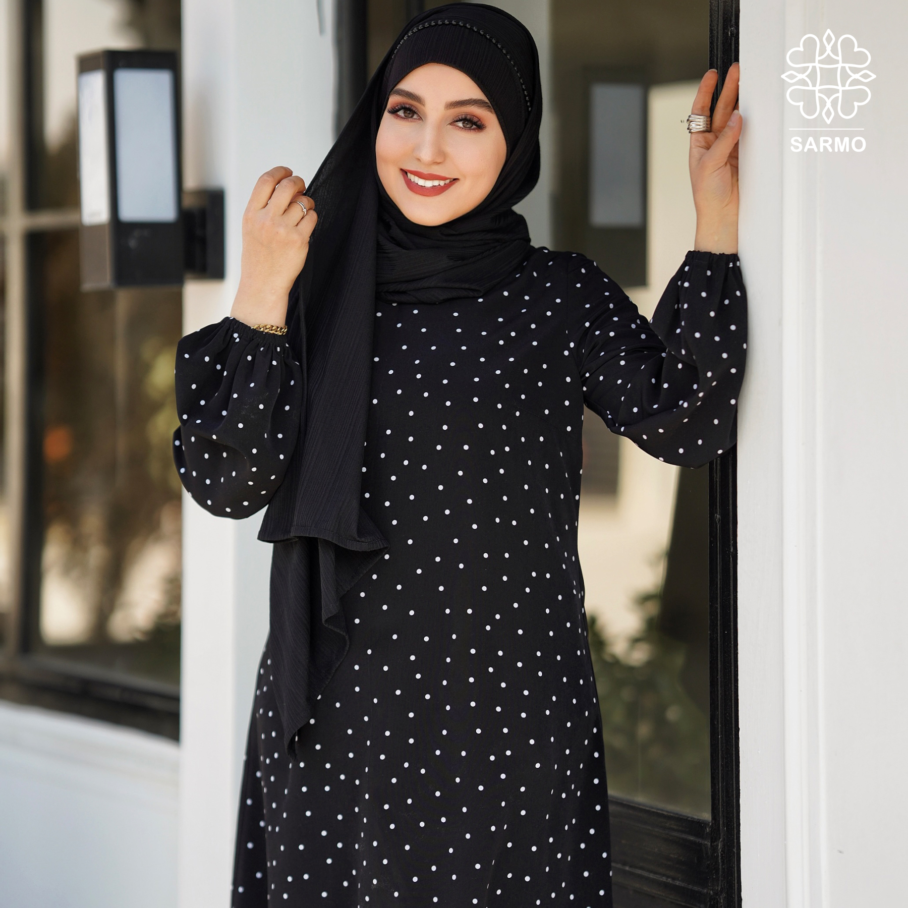 - جنس پارچه کرپ مشکی با خال های سفید درجه یک