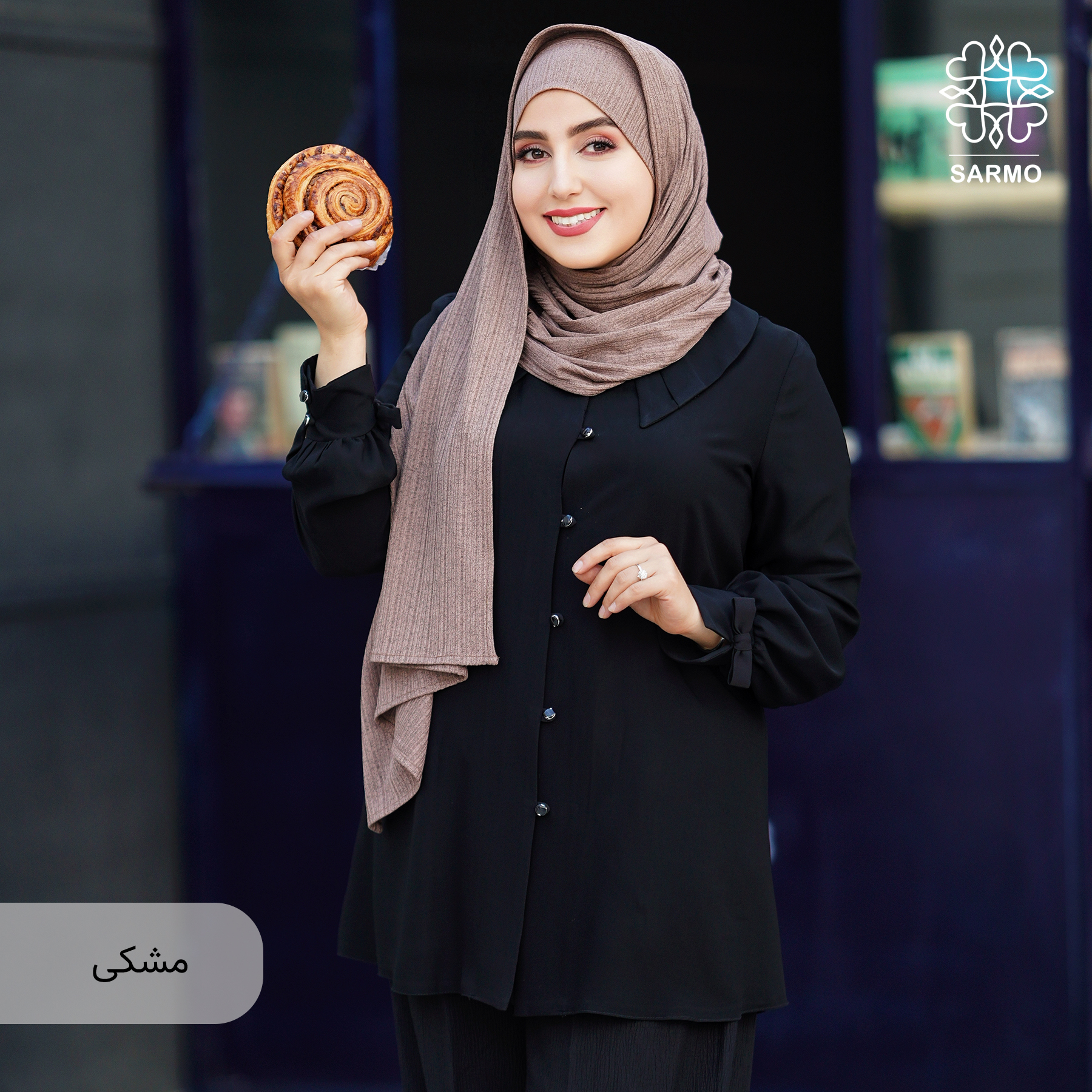 - سرآستین این شومیز پاپیون دارد و با دکمه بسته میشود