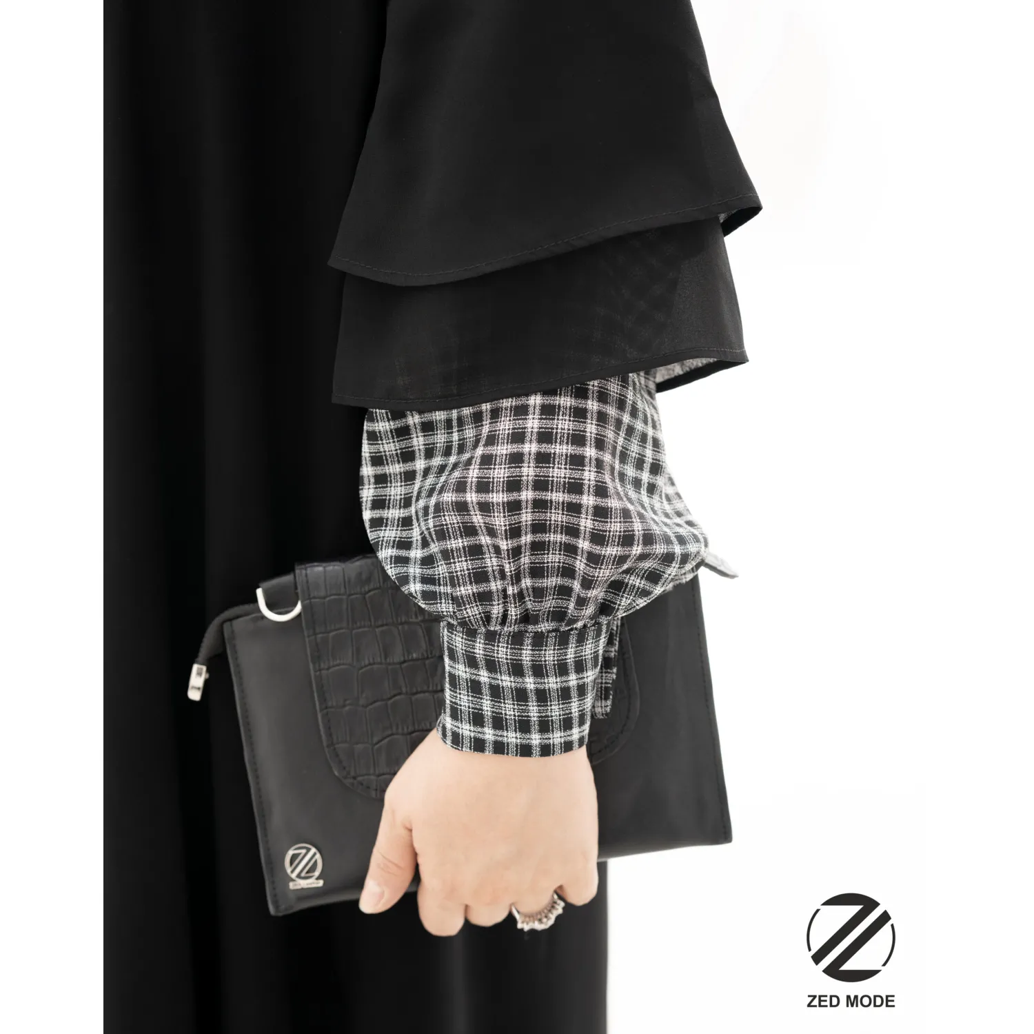 جنس عبا : بیس کرپ کره ای به همراه خرج کار شانتون نخ چهارخونه ترک و کرپ حریر جت بلک