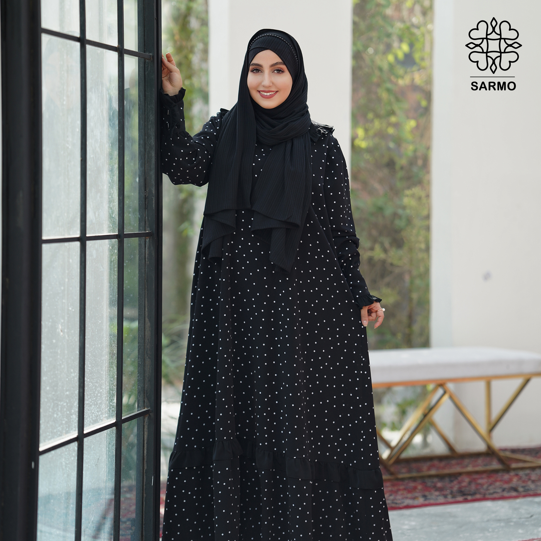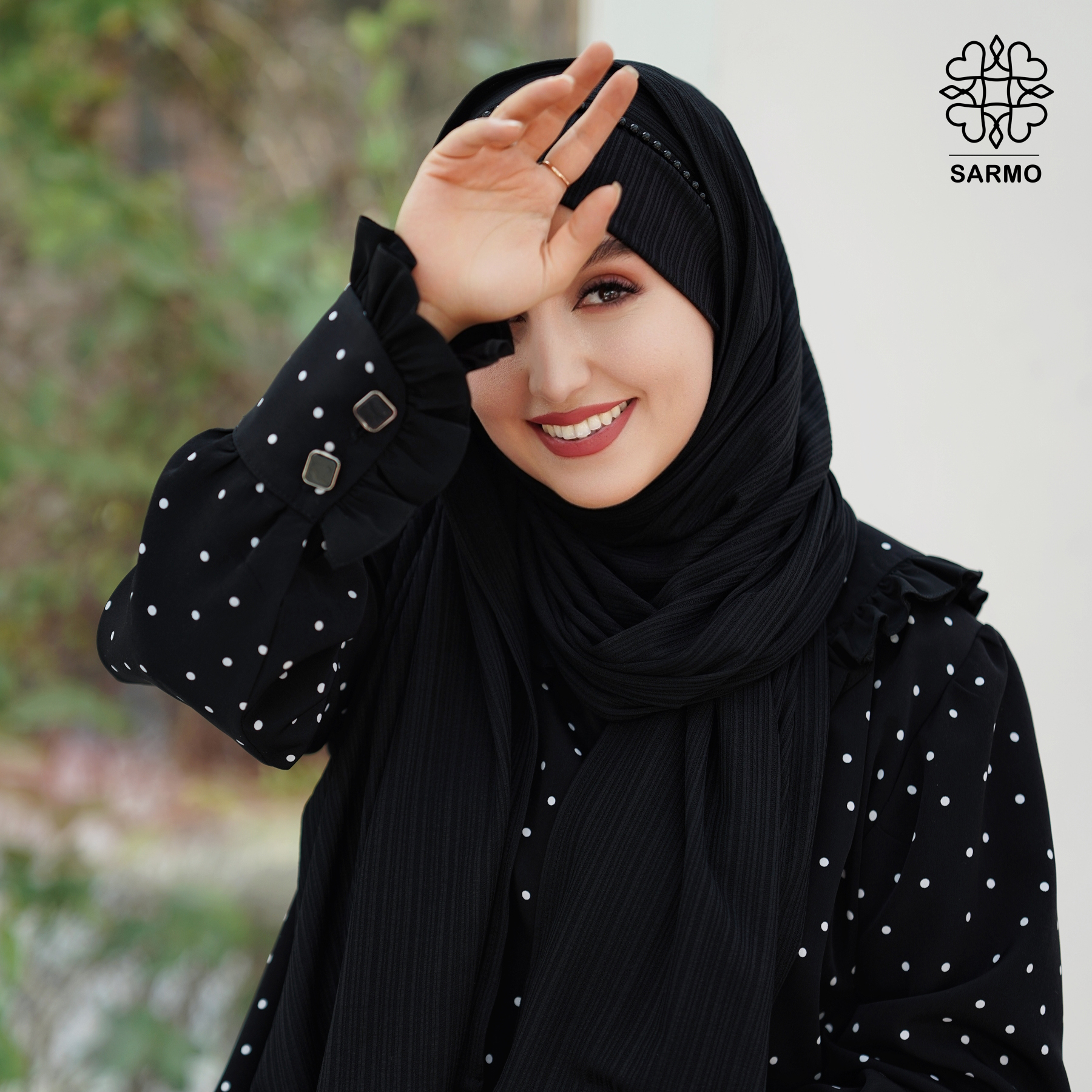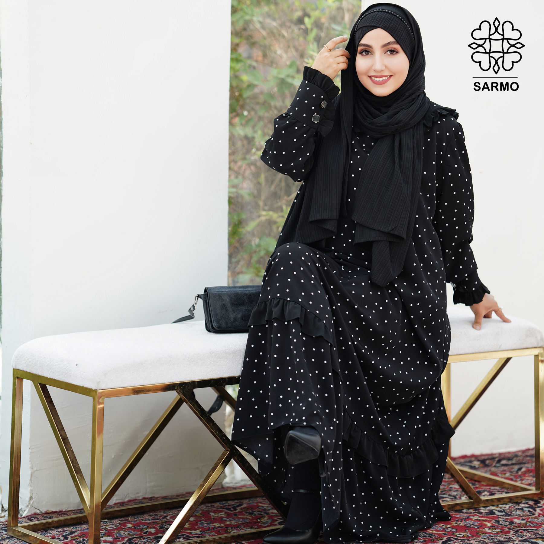 - جنس پارچه کرپ الیزه مشکی با خال های سفید درجه یک