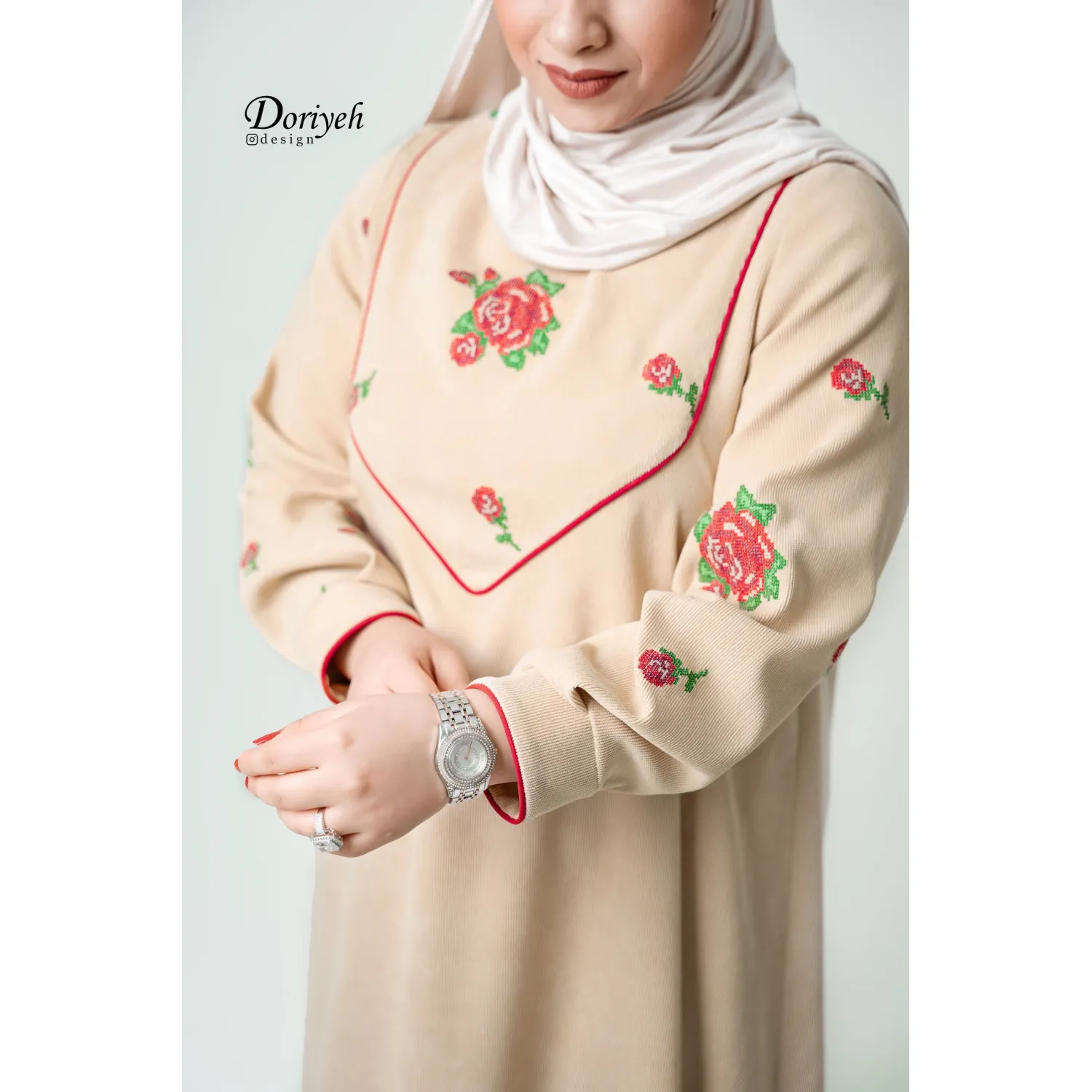 قسمت آستین و جلوی عبا ترکیب شده با مخمل شماره دوزی.