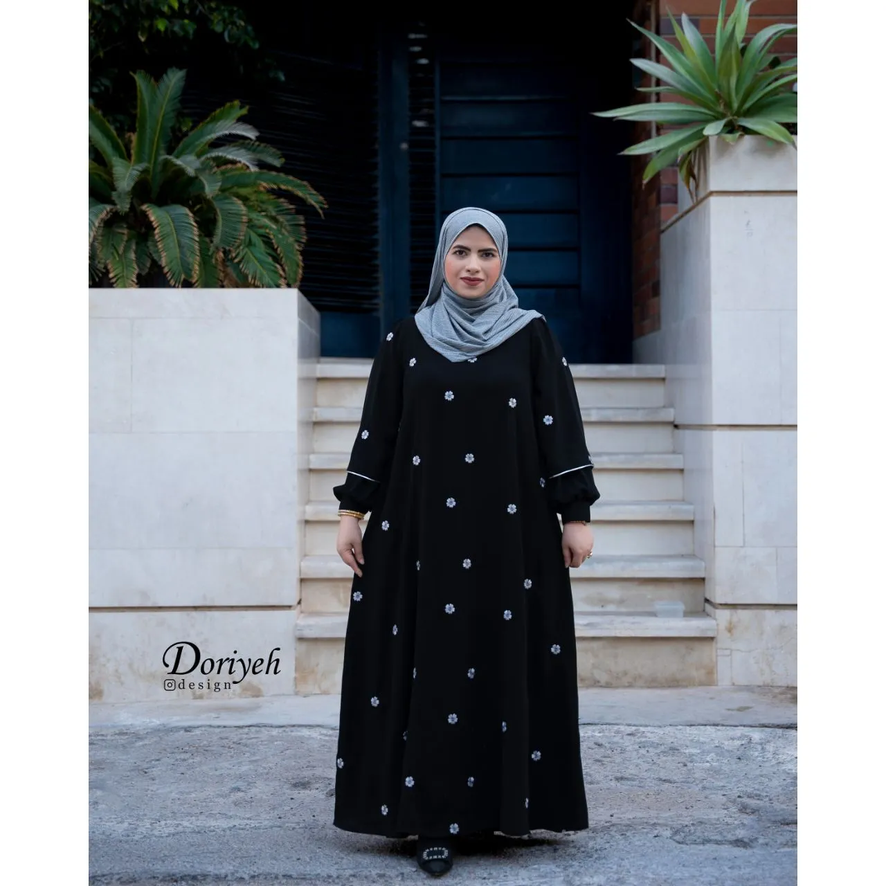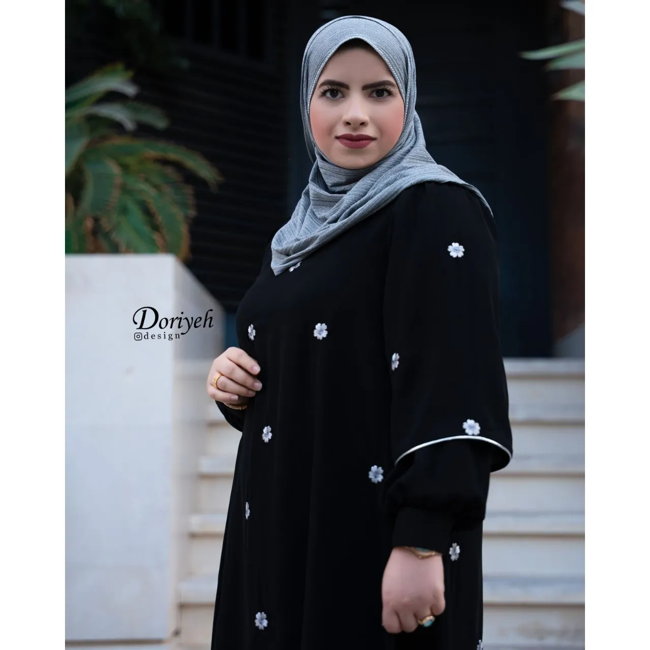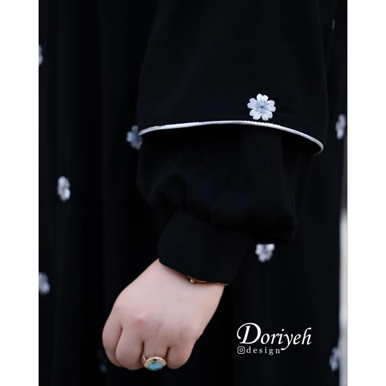 عبا گلدوزیشده با گلهای نقرهای ظریف؛ ترکیبی از سادگی و درخشش.