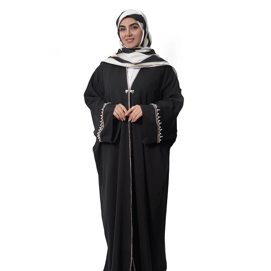 عبای نگین نوریس یک مدل لوکس و شیک است که برای مراسمهای خاص و رسمی طراحی شده است. این عبا با برش کیمونو که راحتی و آزادی حرکت را فراهم میآورد، جلوهای متفاوت و زیبا ایجاد میکند. قسمت جلو باز بوده و با یک سنجاق بسته میشود که امکان تنظیم راحت عبا را فراهم میکند. طراحی آن با خرجکار نوار نقرهای و مروارید سفید تزئین شده که به عبا درخشندگی و زیبایی خاصی میبخشد. علاوه بر این، آستینهای گشاد و جنس قطری پارچه، راحتی بیشتری به پوشنده میدهد و جلوهای لطیف و شیک به عبا میبخشد. این مدل به دلیل ترکیب طراحی مدرن و جزئیات فاخر، گزینهای ایدهآل برای افرادی است که به دنبال پوششی متفاوت و متمایز برای مجالس خاص هستند.