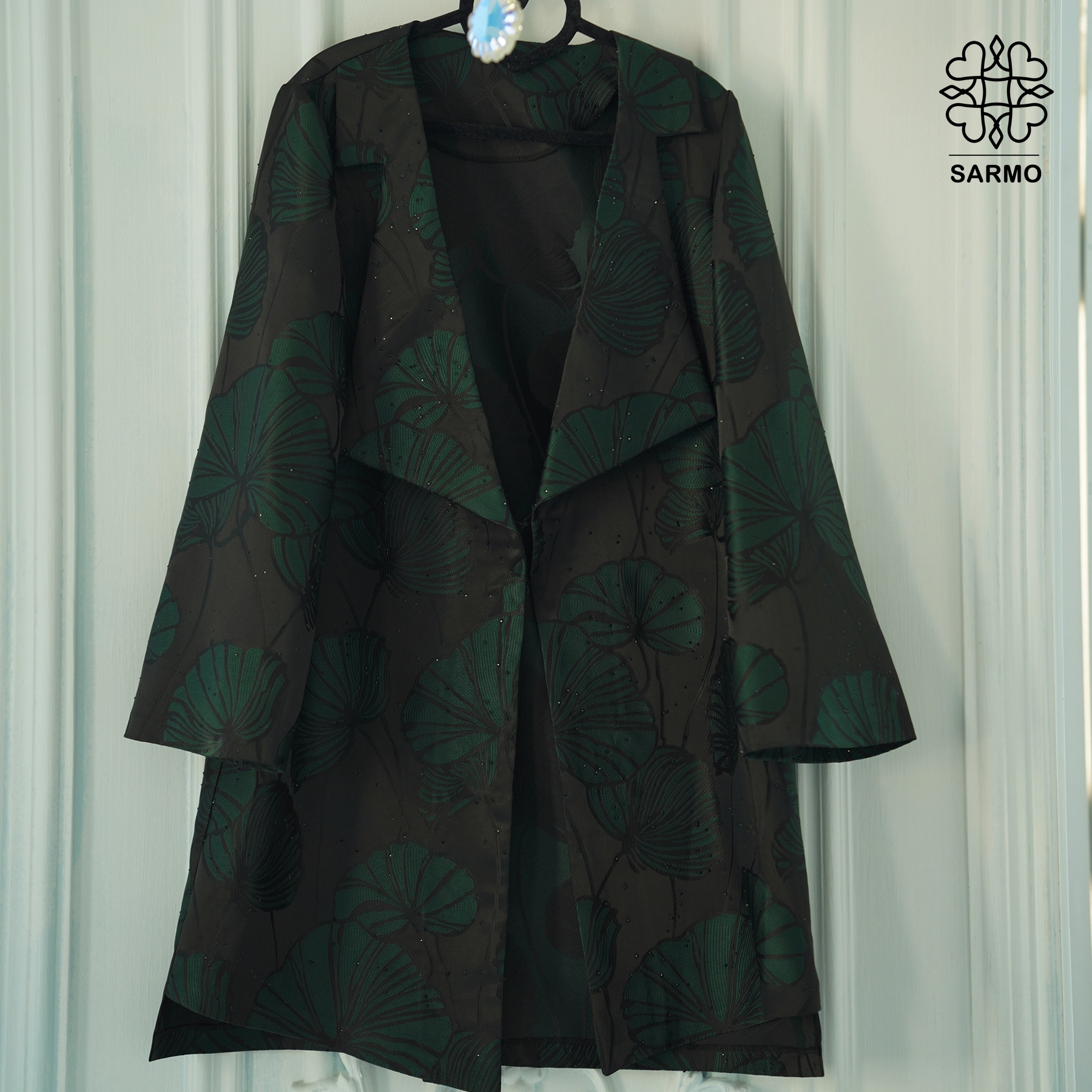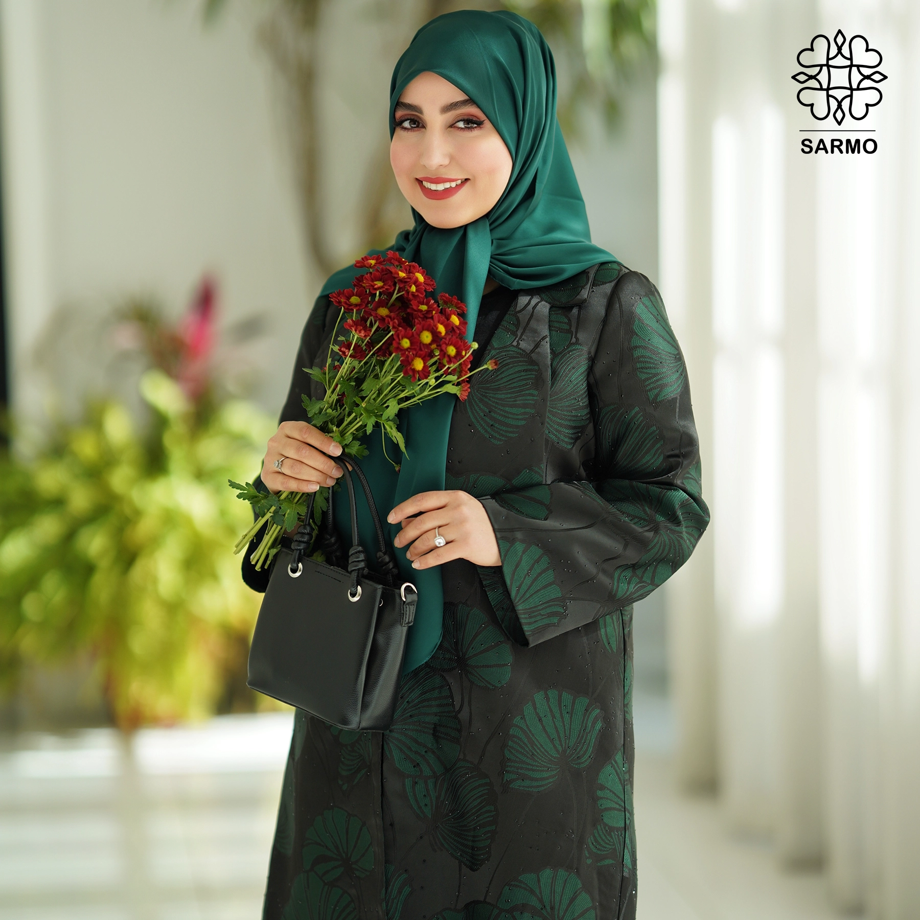 جنس پارچه: ژاکارد ابریشم اعلا دورنگ با جلوهای لوکس و ایستایی مناسب. روی پارچه بهصورت پراکنده نگینکاری شده که درخشش ظریف و خاصی به لباس می بخشد.