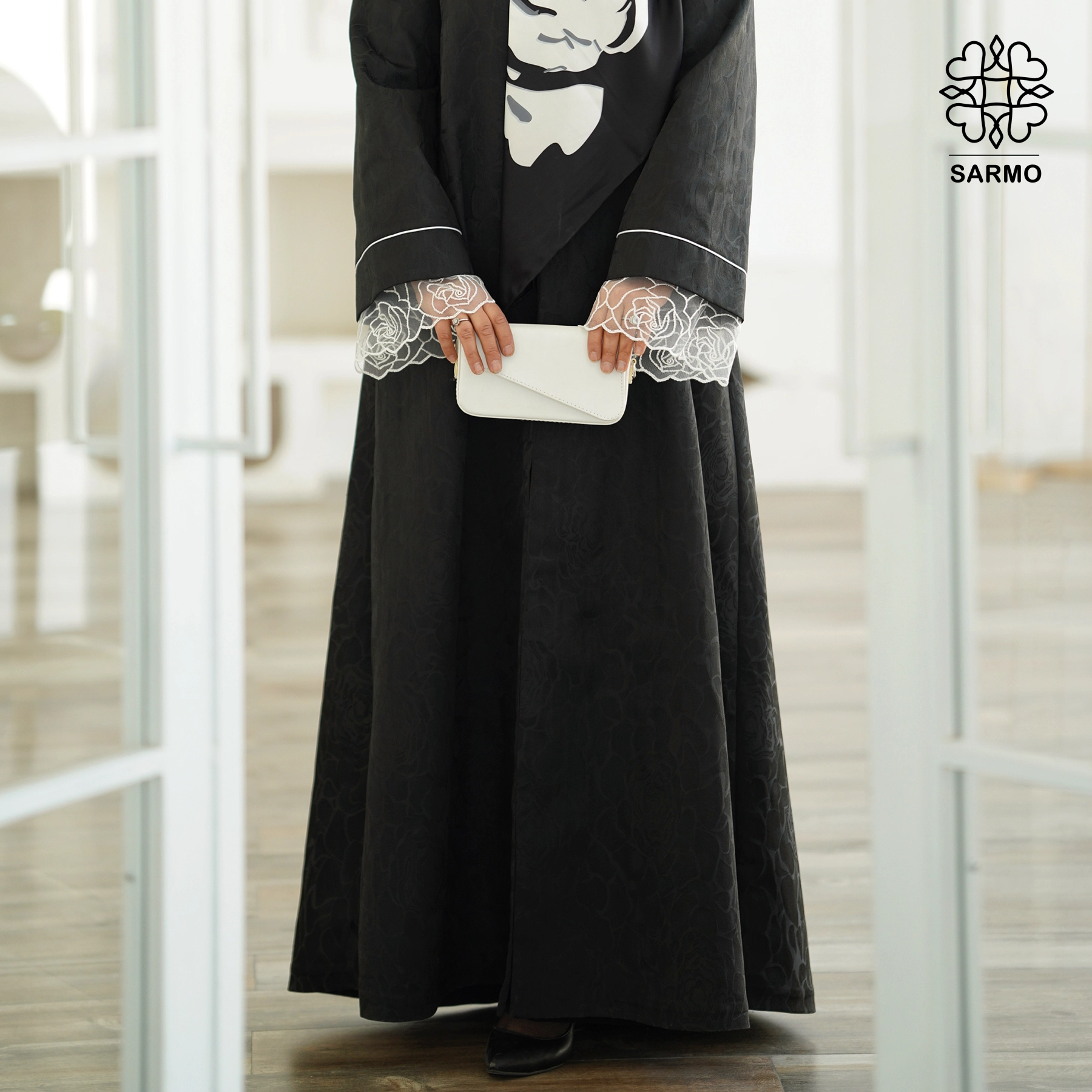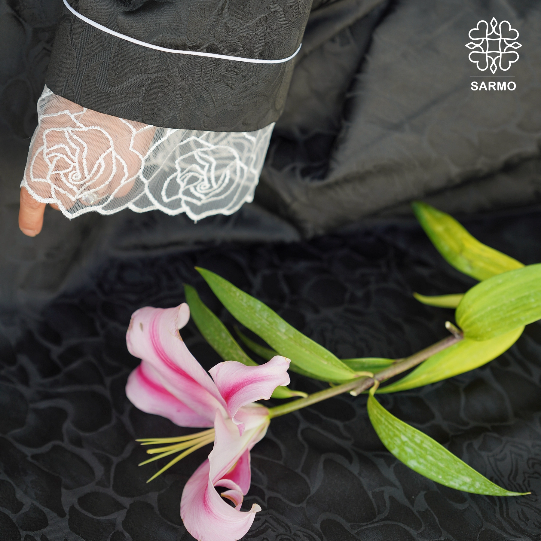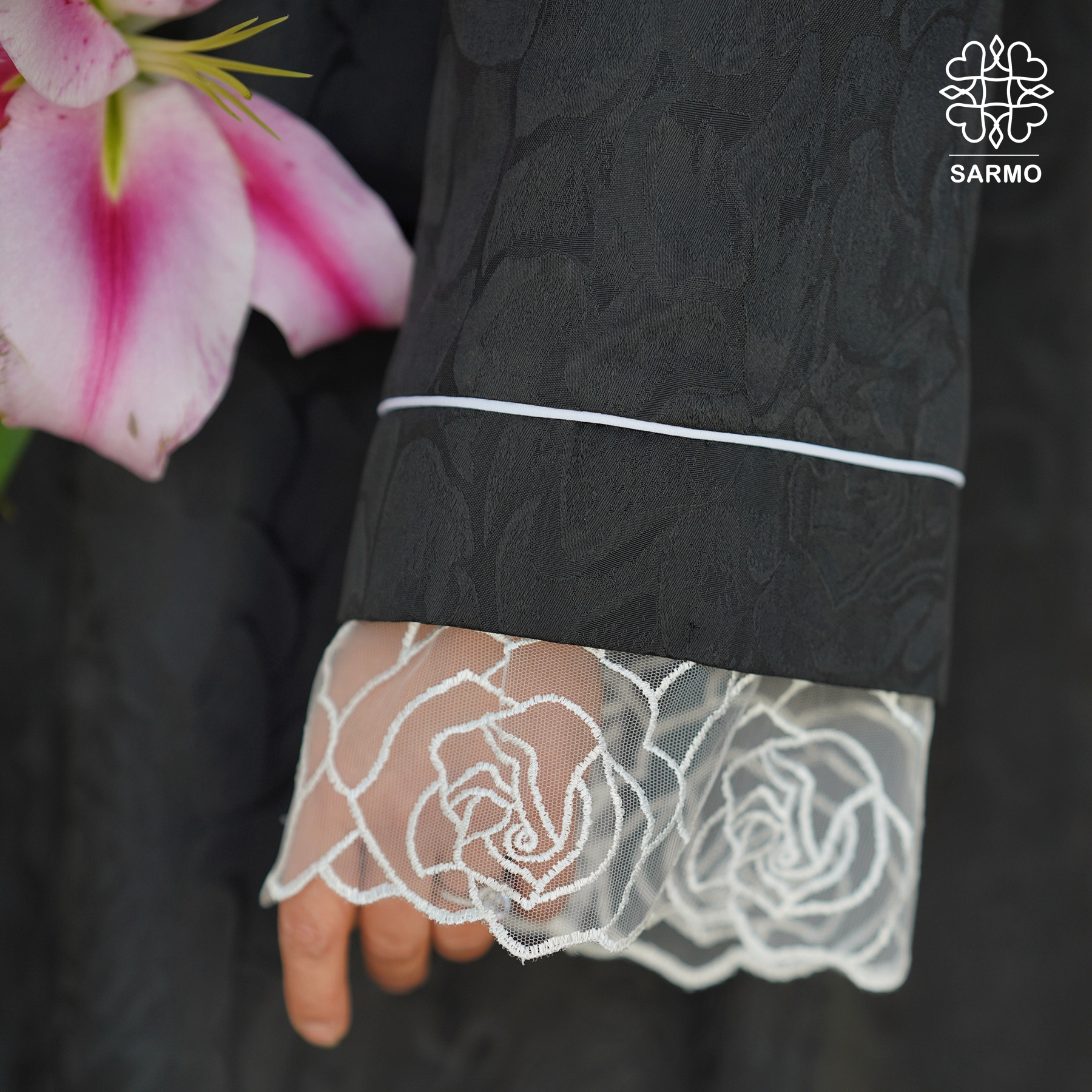 جزئیات آستین: آستینها با تور سفید وارداتی (طرح رز شنل) و یک ردیف مغزی سفید تزئین شده تا جلوهای ظریف و شیک داشته باشد.