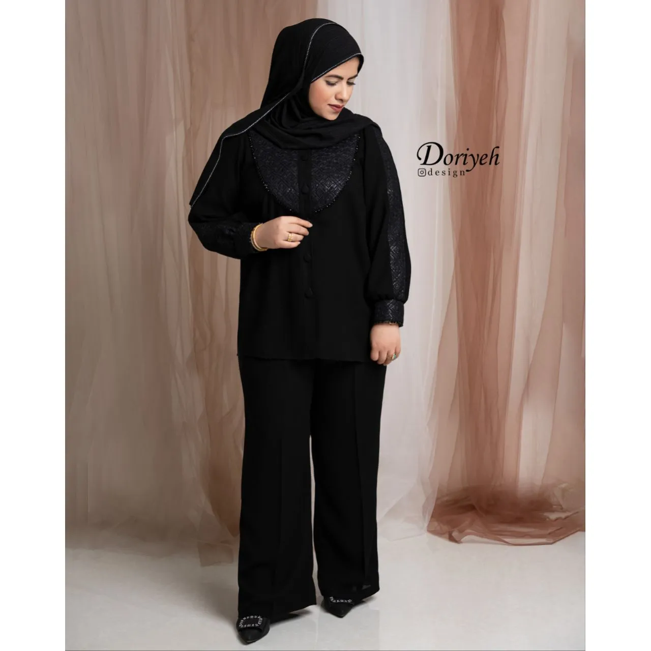 قسمت جلو و مچی مانتو دارای نوارهای کریستالی میباشد.