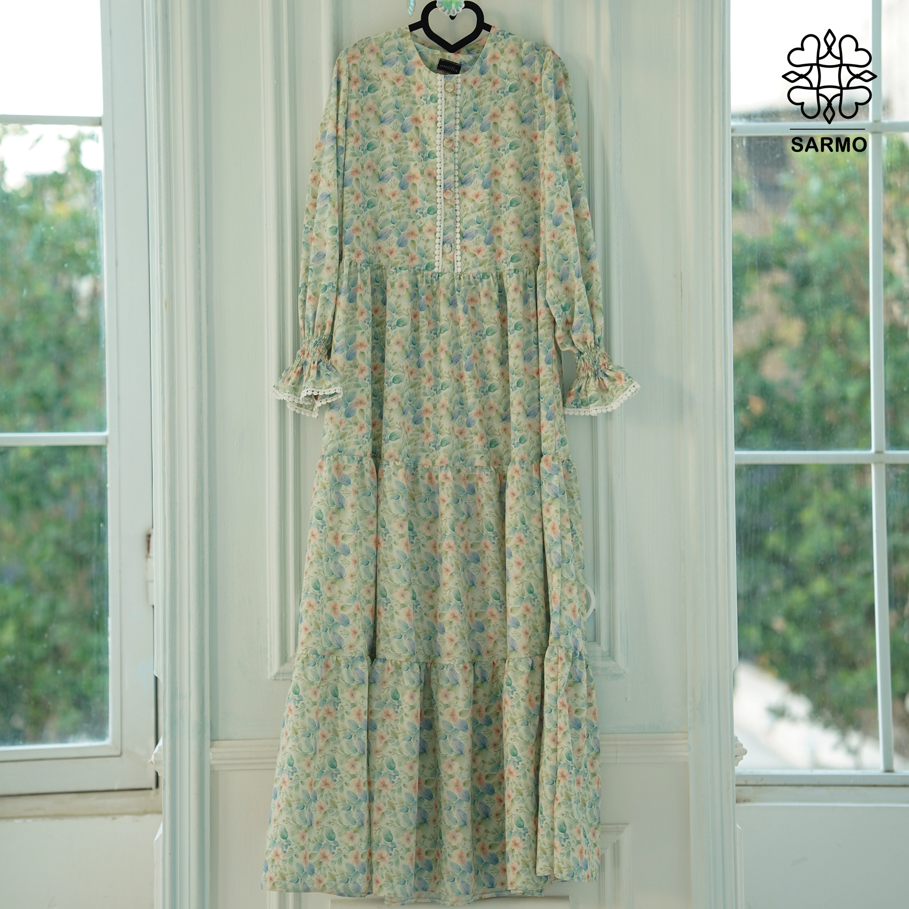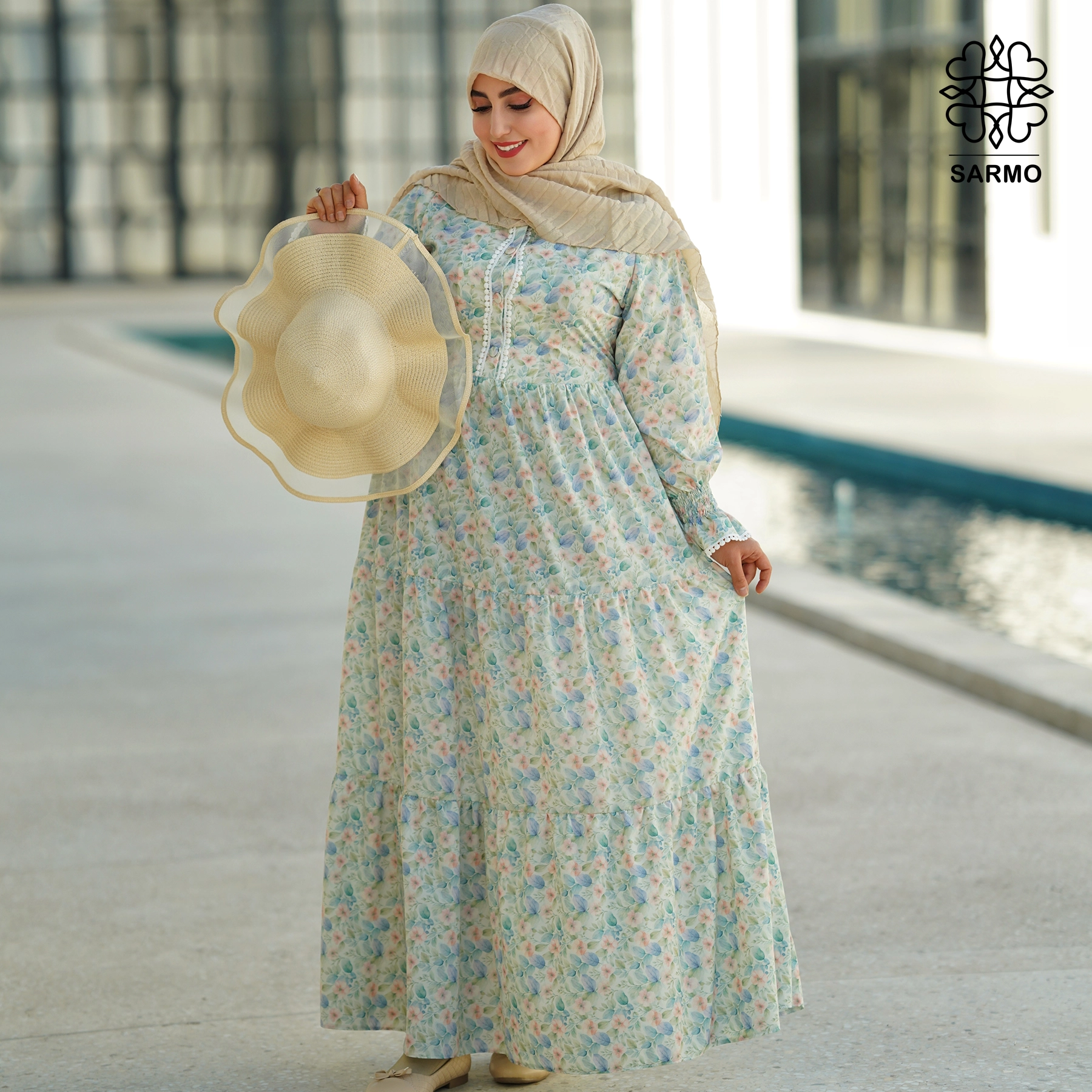 عبا از قسمت کمر برش خورده و دامن با سه ردیف چین زیبا به خط کمر متصل شده تا در حرکت فرم چشمنواز و لطیفی ایجاد کند.
