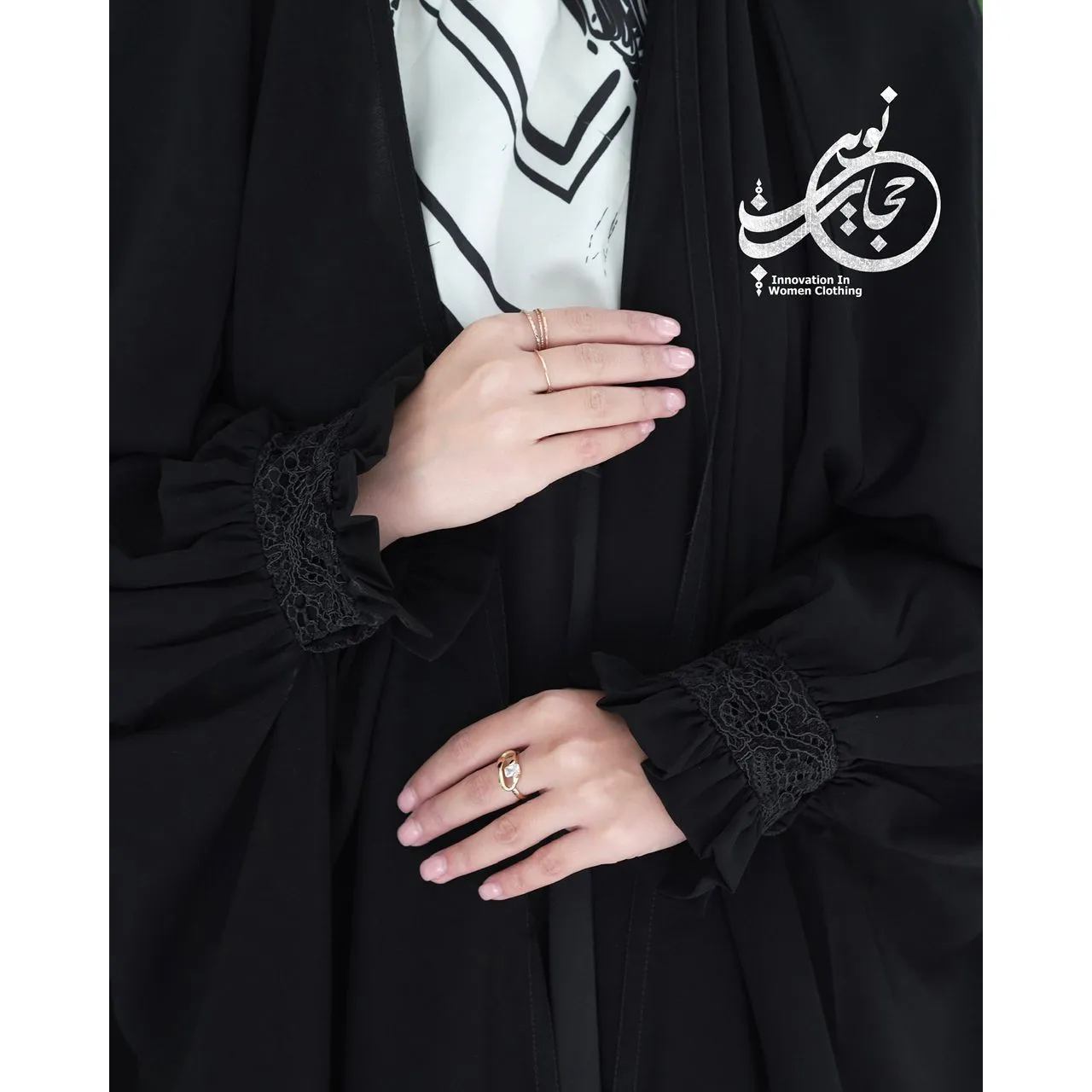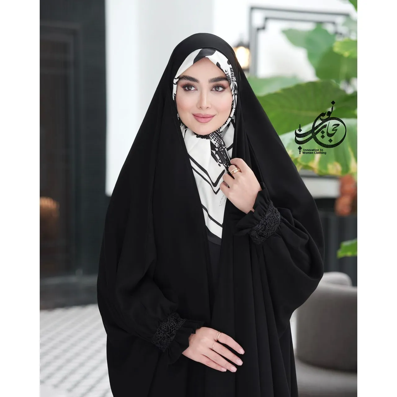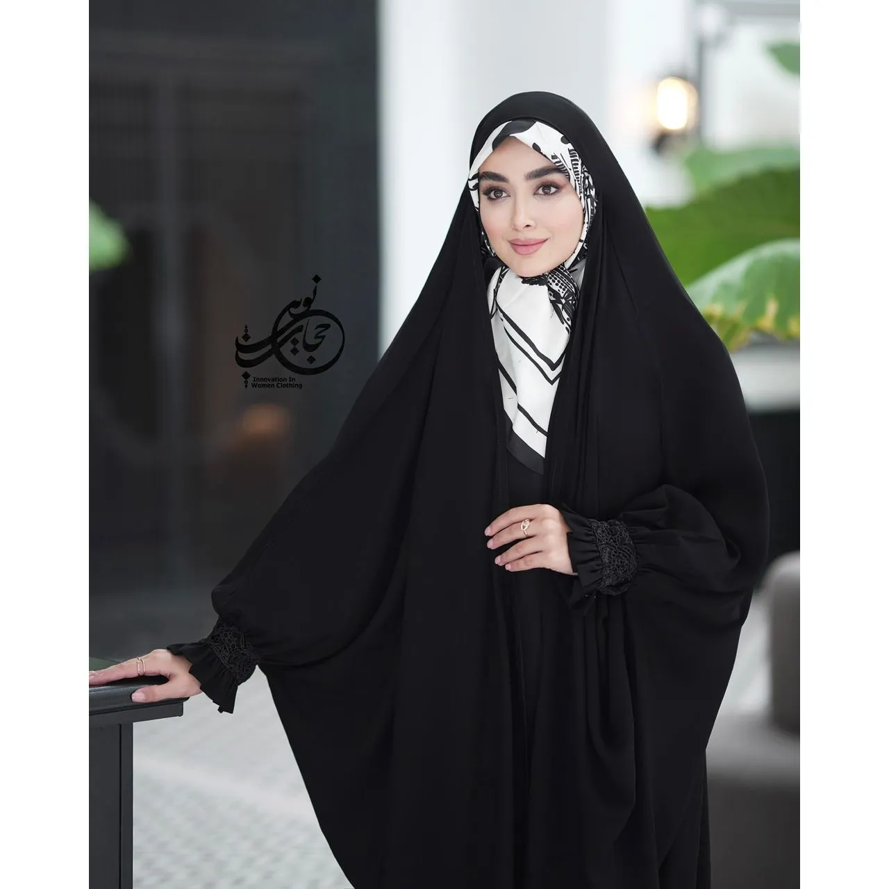چادر عربی شمیم با مچی دانتل مخمل، با جنس کرپ حریر اسود جت بلک درجه یک گرید a