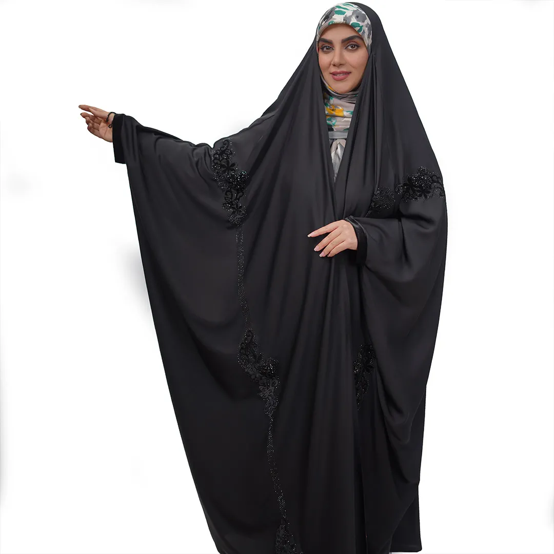 این چادر با بهترین و مرغوب ترین جنس پارچه تولید و عرضه می شود . مخمل های این طرح از جنس درجه یک ونوس ایتالیایی می باشد که تماما با لیزر بصورت گل برش خورده و ابتدا با چسب به چادر متصل و بعد با نخ کاملا محکم دوخته و روی مخمل 12 گل برجسته که با کریستال مخروطی کار شده است و نگین های درجه یک دی ام سی که بصورت دو لاینی روی شانه ها از پشت تا روی جلوی چادر نگین کاری شده. همچنین از این مخمل به اندازه 3 سانت دور مچ چادر دوخته شده و بندینک چادر بصورت تمام کریستال جواهر دوزی شده و درخشش کار بیشتر شده .