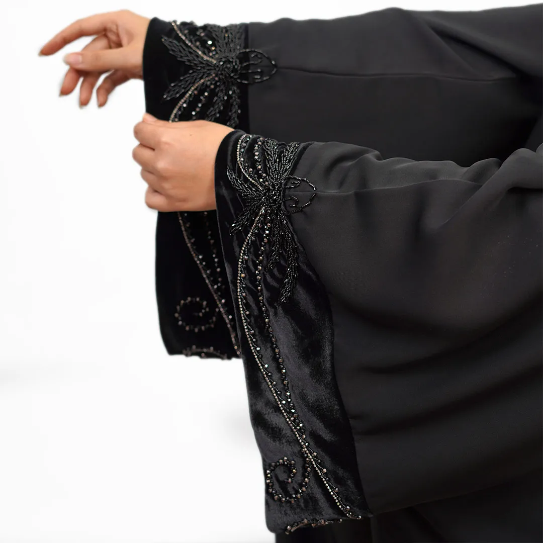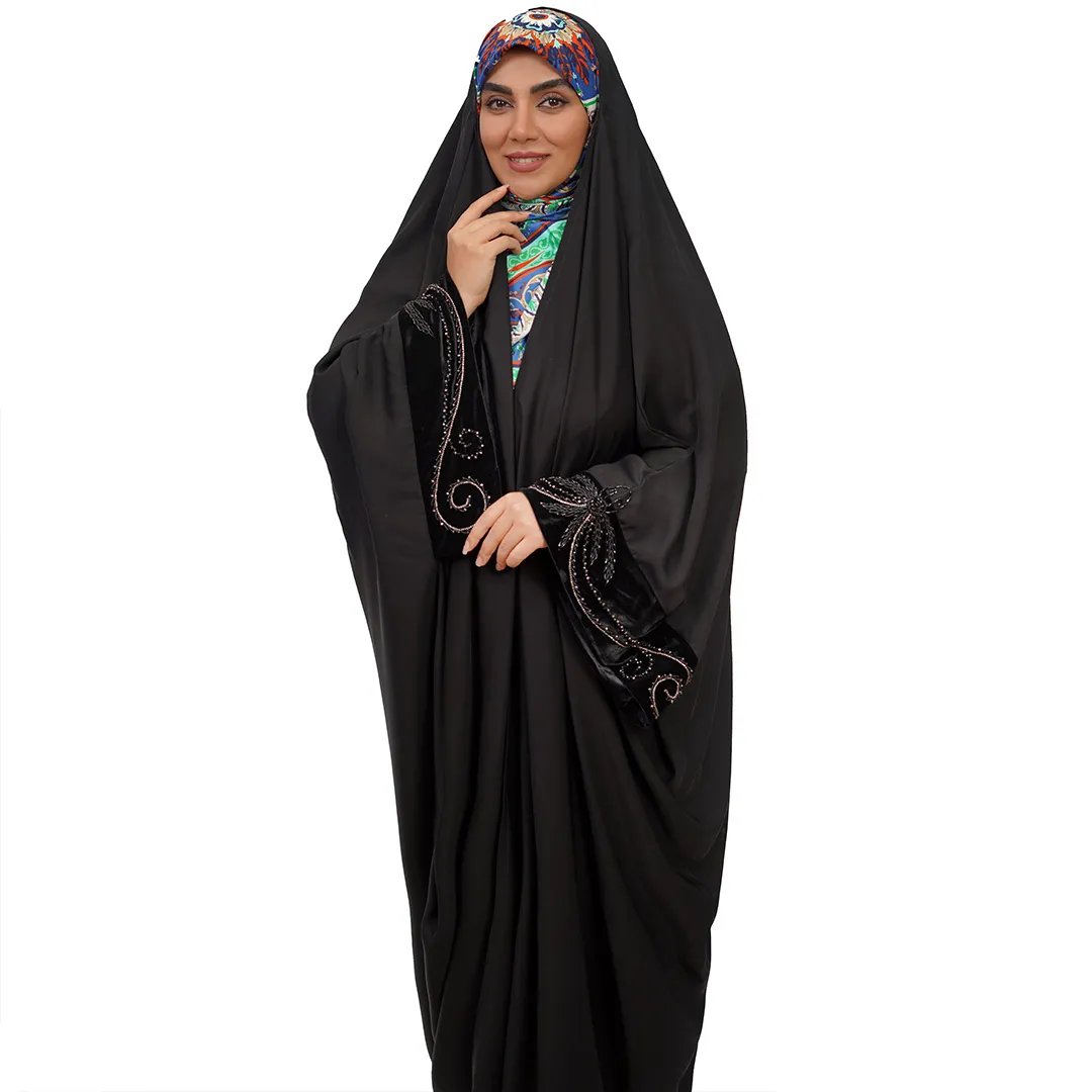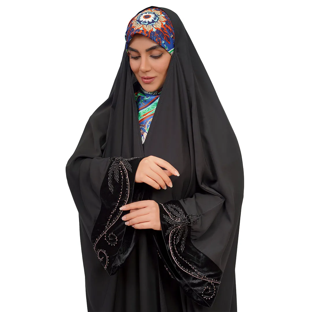 مدلی بهتر برای اندام خود پیدا کنید یا می توانید با انتخاب چادر کار شده به شیک و خاص بودن استایل خود بیفزایید چادر های یاسمین با جواهر دوزهای فاخر پیشنهاد ما به شما بانوان ایرانی هست که به دنبال چادری جدید متفاوت هستید . طرح جانان با طراحی آستین مخمل که به گشادی عرض 38 سانت و به طول 8 سانت با مخمل اصل کره روی چادر حریر قطری اصل متصل شده که روی این مخمل ملیله شکسته / منجوق / کریستال 4 دودی مشکی / سنگ متری / با نخ ابریشم روی کار تماما جواهر دوزی شده یک طرح بی نظیر و زیبا طراحی شده . متریال طوری انتخاب شده که روی کار به هیچ عنوان نخکشی ایجاد نمی شود.