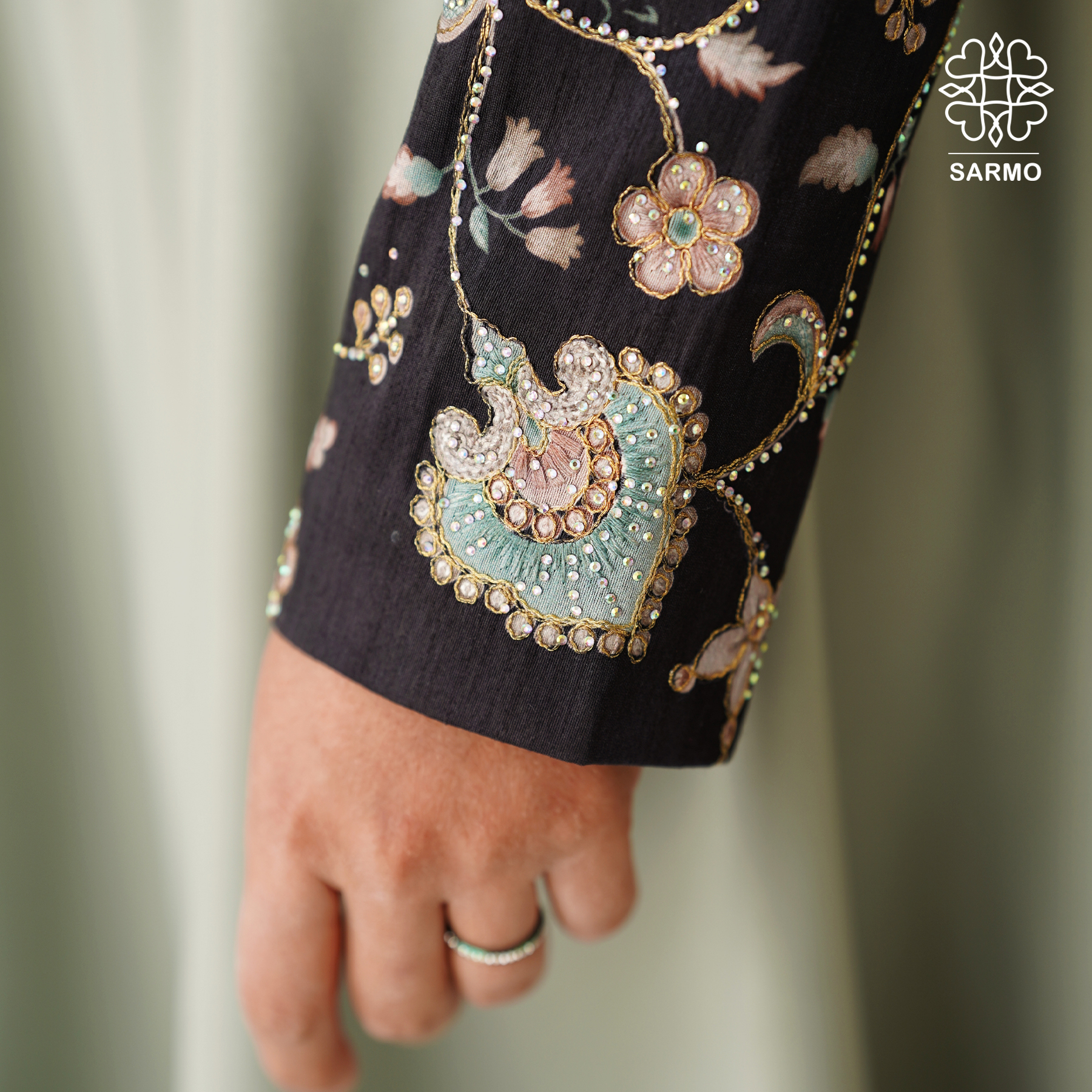 - جنس پارچه: تافته ابریشم هندی، با بافتی نرم و لطیف، درخشش طبیعی و ایستایی بینظیر، حس لوکس بودن را به شما القا میکند.