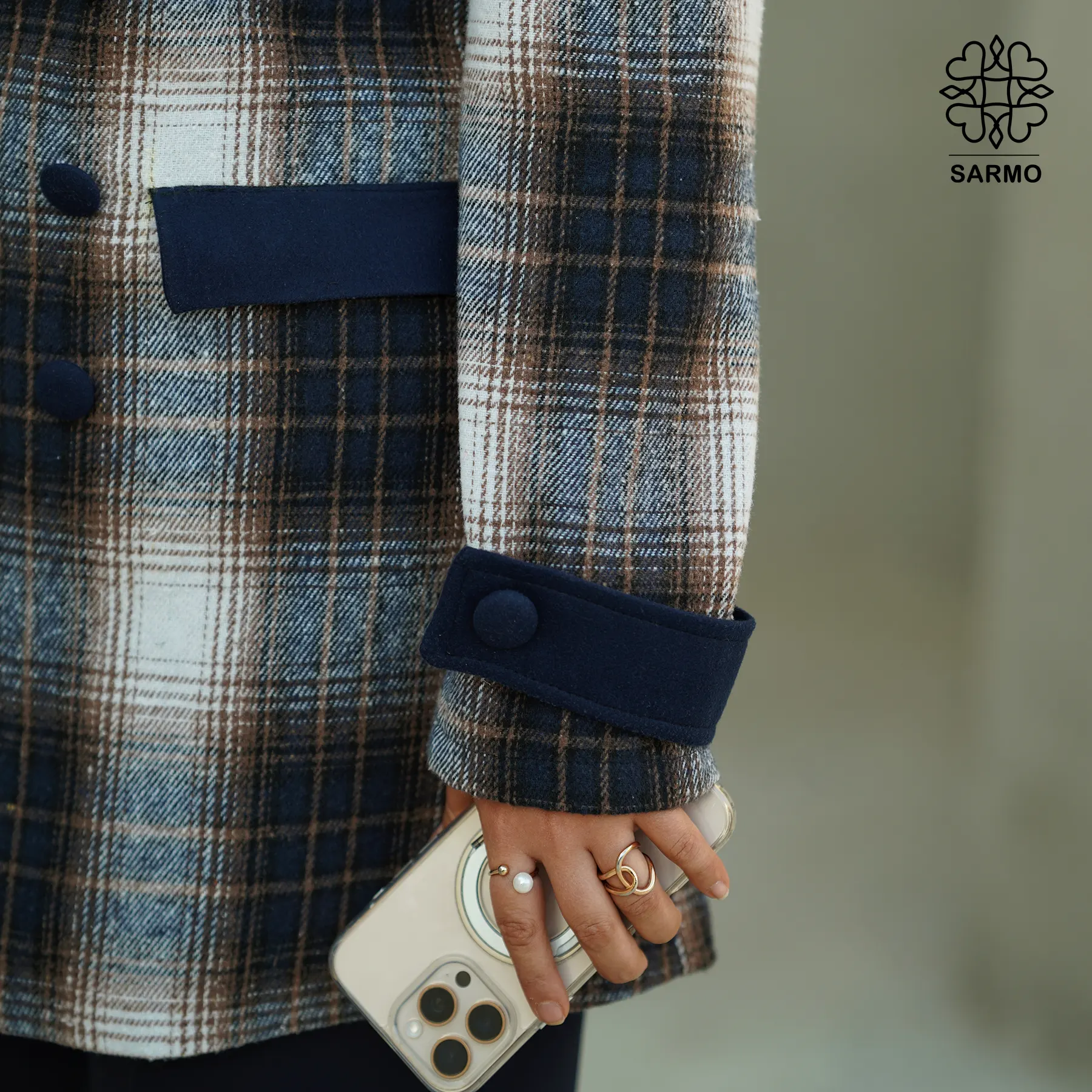 جزئیات طراحی: دکمهها و جیبها نمایشی هستند و به زیبایی ظاهری کت افزودهاند.