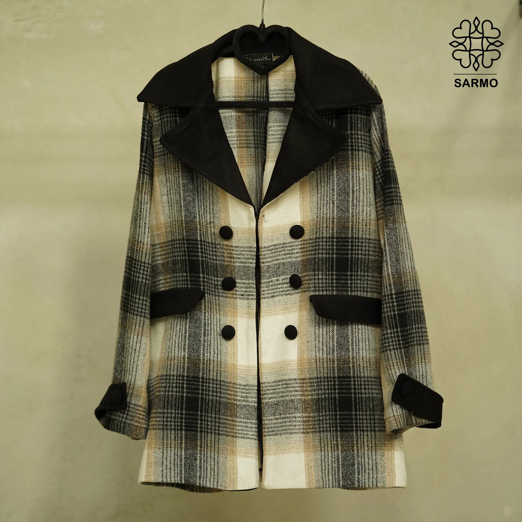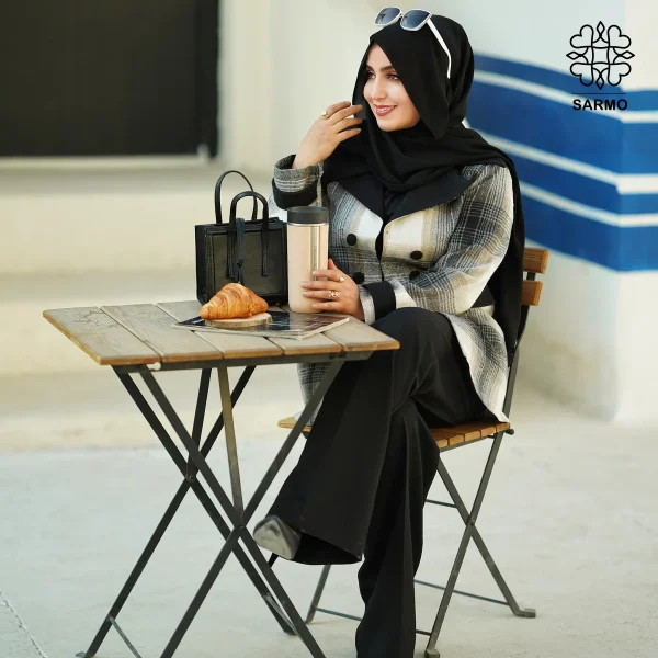 - مدل یقه: دارای یقه انگلیسی با طراحی کلاسیک و ظریف که ظاهر کت را رسمی و خوشفرم میکند.