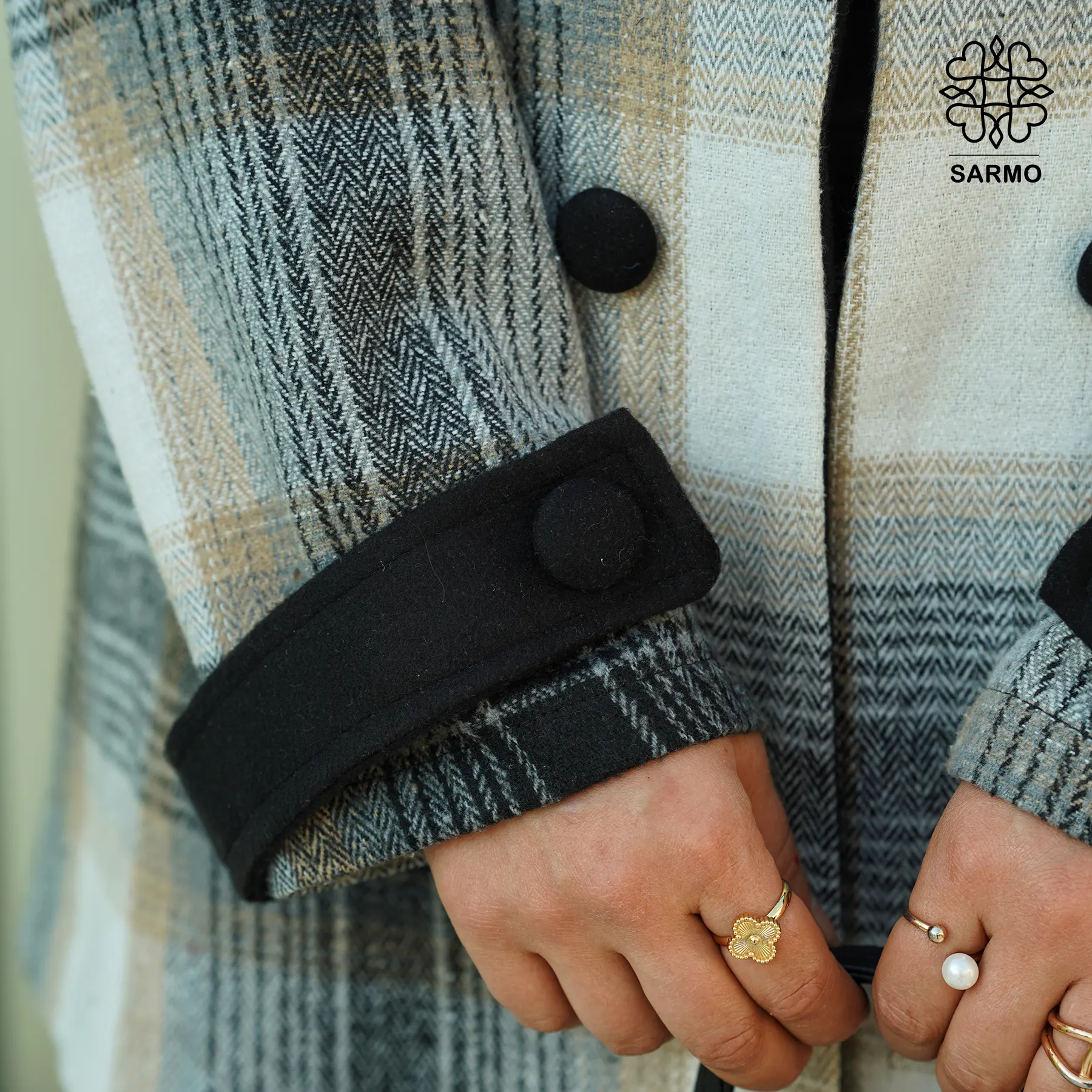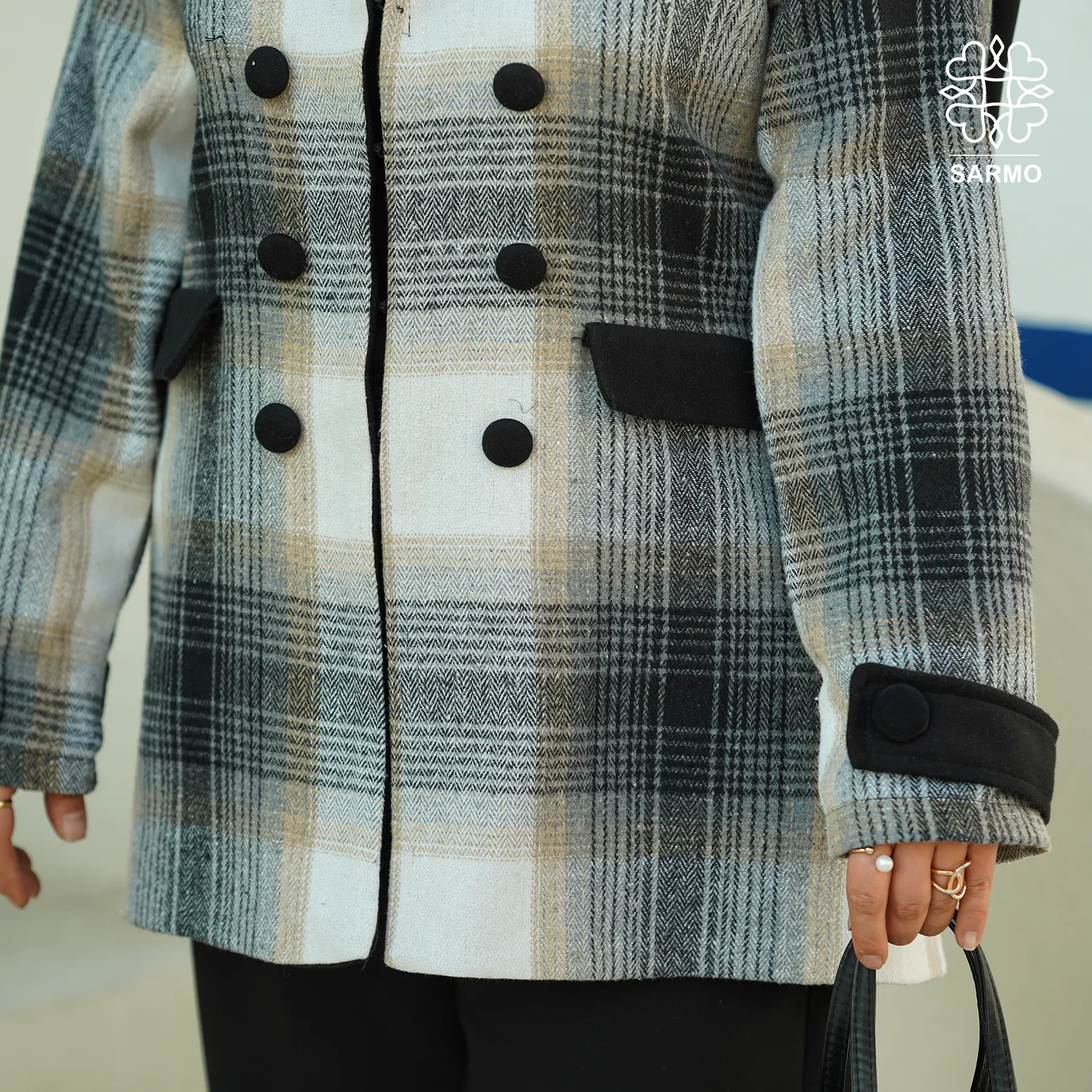 دکمهها و جیبها نمایشی هستند و به زیبایی ظاهری کت افزودهاند.